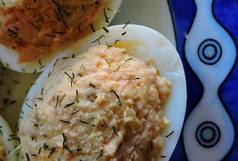 Una vez que disponemos de las yemas, las trituramos con la ayuda de un tenedor, añadimos la mayonesa, la mostaza, el atún muy bien escurrido, sal, pimienta, eneldo picado, cebolla y ajo finamente picados y el zumo de limón.Mezclamos todo muy bien. Cogemos las mitades de claras y las rellenamos con la deliciosa pasta de atún. Colocamos los huevos rellenos sobre un plato llano o una bandeja y espolvoreamos con eneldo picado. Nos resultara un plato precioso de entrante para la mesa de estas Navidades!Delicioso, exquisito,mmm!Enjoy it!