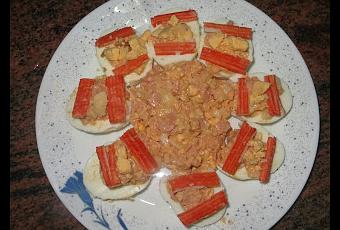 Elaboración:Lo primero que hacemos es cocer los huevos, ya sabemos cuando el agua empiece a hervir, los metemos y los tenemos durante diez minutos. Una vez pasado el tiempo, refrescamos el agua y cuando estén fríos los pelamos, los partimos por la mitad y separamos las yemas de las claras.Mientras se están cociendo los huevos, nosotros podemos empezar con nuestro relleno, partimos en trozos muy pequeños, los palitos de surimi, el jamón de york, la cebolla y las yemas de huevo. Le echamos salsa rosa o de cocktail al gusto y luego vamos rellenando los huevos. Yo me guarde algunas tiras de surimi y como estamos jugando la Eurocopa lo puse a modo de bandera de España, si no lo podéis adornar con más salsa rosa.