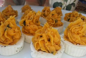 - Cuando los huevos se gelifiquen hacemos huecos con una cuchara para rellenarlo luego. Desmoldamos los huevos y los reservamos.