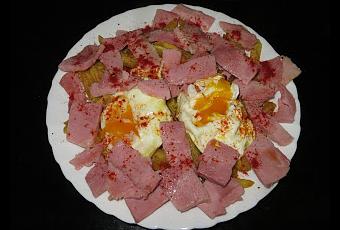 En ese mismo aceite freís los huevos a fuego fuerte y mientras tanto metéis el lacon un par de minutos al microondas. Ahora llega el momento de montar el plato, ponemos de base las patatas encima el lacon y los huevos y espolvoreamos un poco de pimentón dulce por encima. Añadimos un chorrito de aceite, rompemos los huevos y ya está listo para comer.