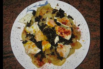 Elaboración:Lo primero que hacemos es lavar y pelar las patatas. Las cortamos en rodajas, las salamos y las echamos en una sartén con abundante aceite a fuego medio. Cuando las patatas están casi listas, en otra sartén echamos un poco de su aceite y comenzamos freír la morcilla, que estará desmenuzada.Sacamos las patatas a papel absorbente y las colocamos en el plato donde las vayamos a servir, espolvoreamos un poco de queso rallado por encima para darle un toque diferente. En la sartén donde hemos cocinado las patatas echamos el huevo y lo freímos. Encima del plato de las patatas con el queso añadimos la morcilla desmenuzada y colocamos el huevo coronando todo el plato, echamos un poco de pimentón por encima y ya está listo para degustar.