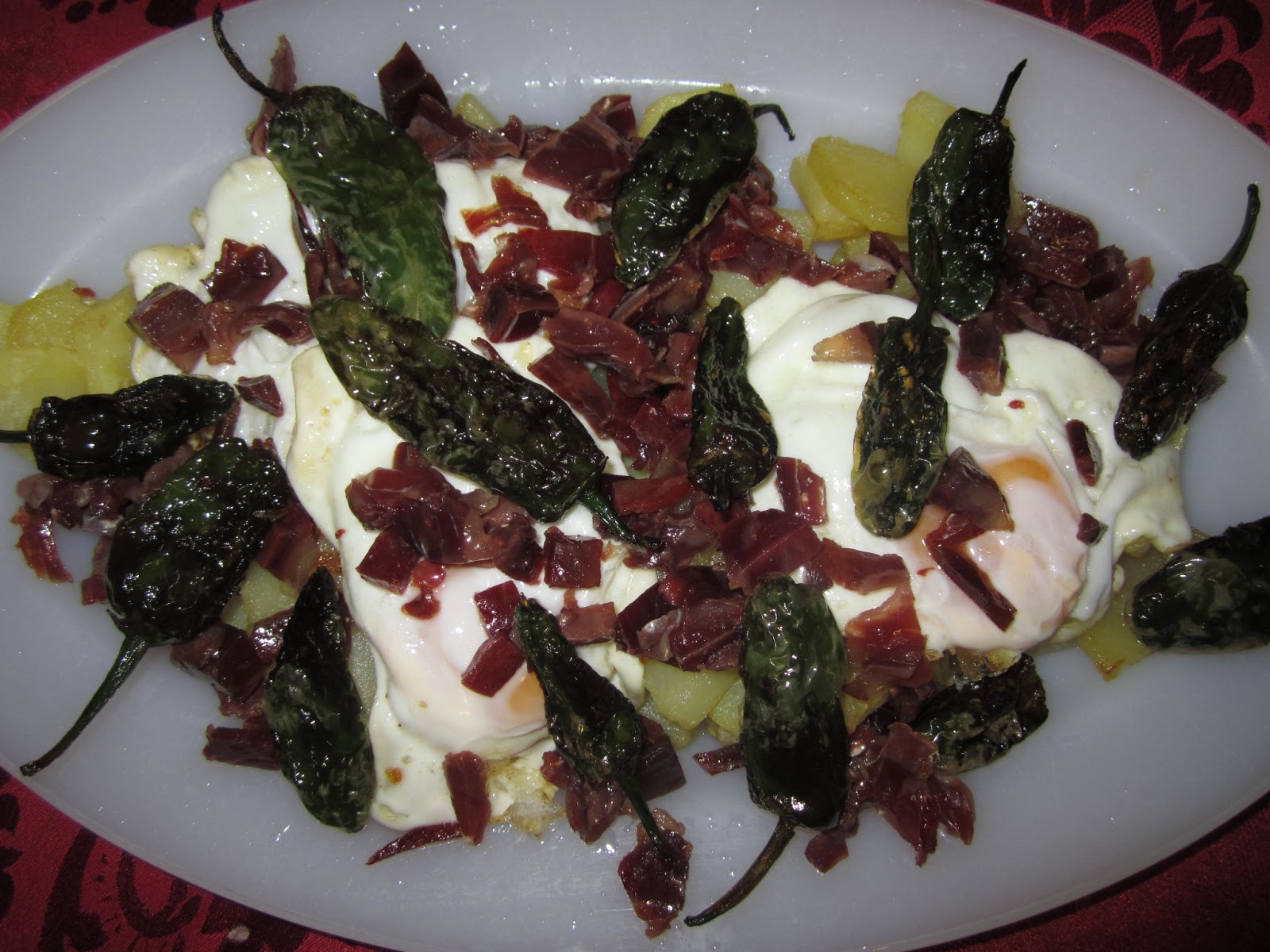 PREPARACIÓN:Como la mayoría de recetas que preparo en mi blog esta es muy sencilla.Con un buen aceite vamos a freir las patatas cortadas como para tortilla, lo haremos a fuego vivo primero para que se doren y luego a fuego lento para que queden blanditas por dentro.Una vez hechas retiramos a un plato, en el mismo aceite freímos un minutos los tacos de jamón, retiramos y ponemos encima de las patatas.Freímos los pimientos de padrón y colocamos también encima.Sólo queda freír los huevos colocar encima, llevar calientes a la mesa, trinchar los huevos y a disfrutar!!