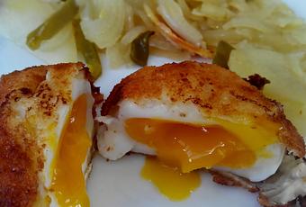 He optado por hacer los huevos al estilo "poché". De esta manera quedan redonditos y fáciles de manejar pero continúan estando tiernecitos y teniendo una yema líquida la mar de vistosa al romper los huevos. Los hemos comido este domingo en casa acompañados de unas patatas panaderas y tras la comida los platos han quedado blancos y relucientes, casi no ha hecho falta meterlos en el friegaplatos. También pueden quedar muy bien con unas patatas horneadas a la naranja.Entre las dos posibles, elegí esta receta porque suponía un reto desde el punto de vista técnico, ya que envolver los huevos en bechamel y empanarlos sin romperlos ha tenido su miga. Aún así, a pesar de que algunos quedaron un poco agrietados por fuera, han salido a la primera, por lo que me he quedado bastante contenta con esta receta.
