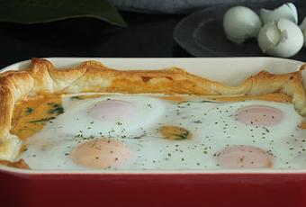 Vierte sobre el hojaldre, introduce en el horno que has precalentado a 180º durante media hora o hasta que el hojaldre esté doradito. Incorpora los huevos en los 10 últmos minutos. Estate atent@, tienes que procurar que la yema no se seque y te quede líquida.
