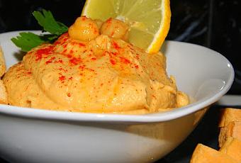 En un bol colocamos los 200gr de garbanzos, con el diente de ajo, la cucharada de tahini, una pizca de pimentón, una pizca de comino, un poco de pimienta negra y una pizca de sal y batimos.