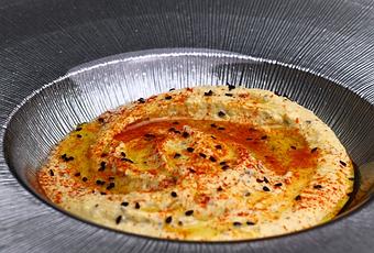 Es una crema de garbanzos que lleva limón, tahini (salsa de sésamo) , sésamo, comino y ajo. Se adereza siempre con pimentón y aceite de oliva. Su origen viene del antiguo Egipto donde se tomaba en trozos de pan tostado.