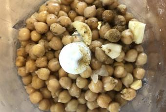 - Coloca los garbanzos en un triturador, agrega el ajo, el limón, el aceite de oliva, el aceite de sésamo, condimenta con sal, pimienta, comino y tritura hasta que quede con una textura de pasta lisa como en la foto.