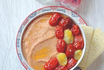 En un procesador de alimentos, poner los garbanzos escurridos, los tomates troceados asados (los cherry son para adornar), el chorrito de zumo de limón, la cucharadita de harissa y un chorrito del aceite de los tomates asados. Triturar todo bien hasta que tenga la consistencia deseada.