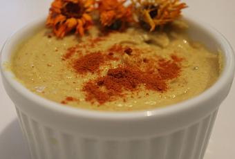 Colocamos los garbanzos cocidos en el vaso de la batidora, añadimos las dos cucharadas de tahin, las especies, un poco de aceite de sésamo, el zumo de limón y dependiendo de la consistencia que le queramos dar más o menos agua mineral.