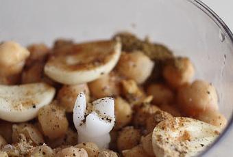 2 dientes de ajo. Cucharadita de tahín (pasta de sesamo). El zumo de un limón. Aceite vegetal. Comino. Pimienta. Sal. -