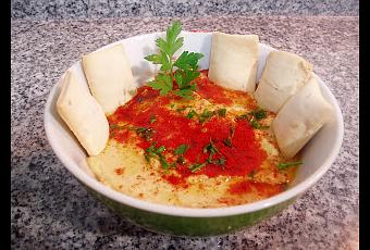 Elaboración:1. En el recipiente de la túrmix echamos ajo, zumo de limón, comino, pimienta, sal, aceite de oliva y los garbanzos.2. Lo trituramos todo y le echamos agua hasta quede como una crema.3. Lo emplastamos y le ponemos por encima aceite de oliva, pimento dulce y perejil picado.