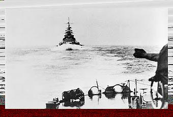 Una instantánea del momento en que el Bismarck encaja el torpedo cuyo blindaje absorbe sin incidencias.