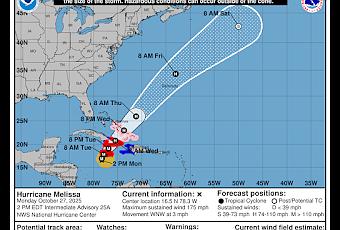 A las 2 de la tarde de este lunes, Melissa se ubicada en los 16.5 norte y 78.3 oeste, 230 kilómetros al sur de Kingston, Jamaica, con vientos de 175 millas por hora (280 kph). Melisa es un huracán mayor categoría 5.