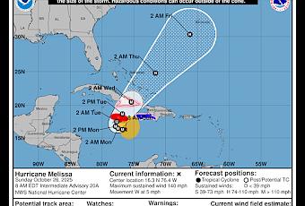 A las 8 de la mañana de este domingo, el huracán Melissa permanecía como huracán mayor categoría 4, con vientos de 220 kilómetros por hora y un desplazamiento extremadamente lento.
