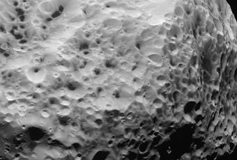 Como era de esperar, se ven muchos cráteres de formas insólitas con un extraño material oscuro en el fondo. Aunque Hyperion tiene unos 250 kilómetros de diámetro, el pequeño tirón gravitatorio sobre la Cassini indica que la mayor parte es espacio vacío y, por tanto, la gravedad superficial es muy baja.