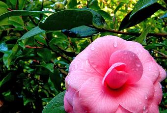 Camelias en medio de un fuerte aguacero. ¡Pobrecitas ellas y pobrecitas nosotras! Muy incómodo hacer fotos en pleno chaparrón.