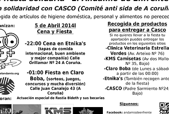 Nos complace anunciar la primera fiesta solidaria de El Andamio de Enfrente. Se celebrará el 5 de Abril en A Coruña con una cena en el Etnika,s (tapas de comida internacional, buen ambiente y mejor compañia) Calle Orillamar Nº 24 en la misma ciudad, para continuar con una fiesta en el Pub Claro Boba donde tendremos sorteos, juegos, concursos y una actuación especial de Rastia Bideth y sus becarias.Nuestra intención no es otra que colaborar con una organización que siempre ha estado del lado del colectivo LGTB y que está sufriendo como nadie, los recortes sociales debidos a la crisis: El Comité Anti-Sida de A Coruña."Casco" tiene varios proyectos en marcha, entre ellos "Punto de Calor" y "Piso de Acogida" (si pulsas encima del enlace tendrás toda la información)