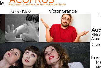 El miércoles 4 de Diciembre en el Centro Ágora de A Coruña a las 20.30h. ACOPROS – Asociación Coruñesa de Promoción del Sordo, celebra su I GALA BENÉFICA ACCESIBLE: MONÓLOGOS + IMPROHUMOR 100% en un evento único que será accesible por primera vez en su totalidad para las personas con discapacidad auditiva al contar con: bucle magnético, subtitulado en directo e intérpretes de Lengua de Signos Española.El precio de la entrada es de 6€, e irá destinado a los programas de atención directa a familias con niñ@ssord@s, jóvenes y adultos con sordera desarrollados por esta Entidad.