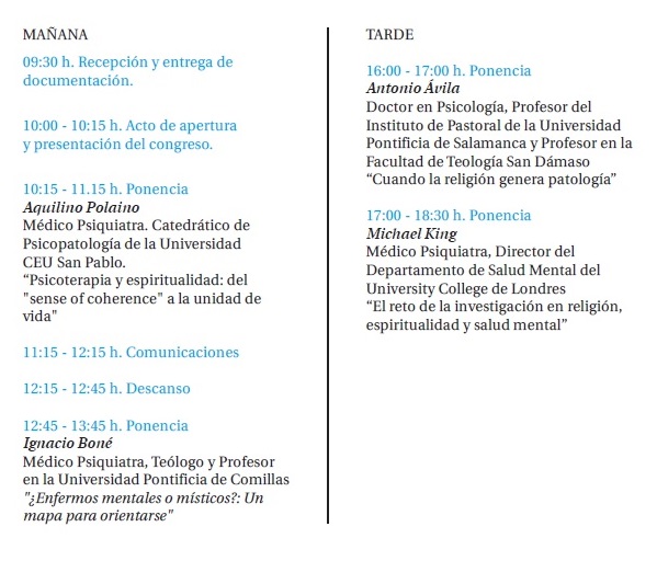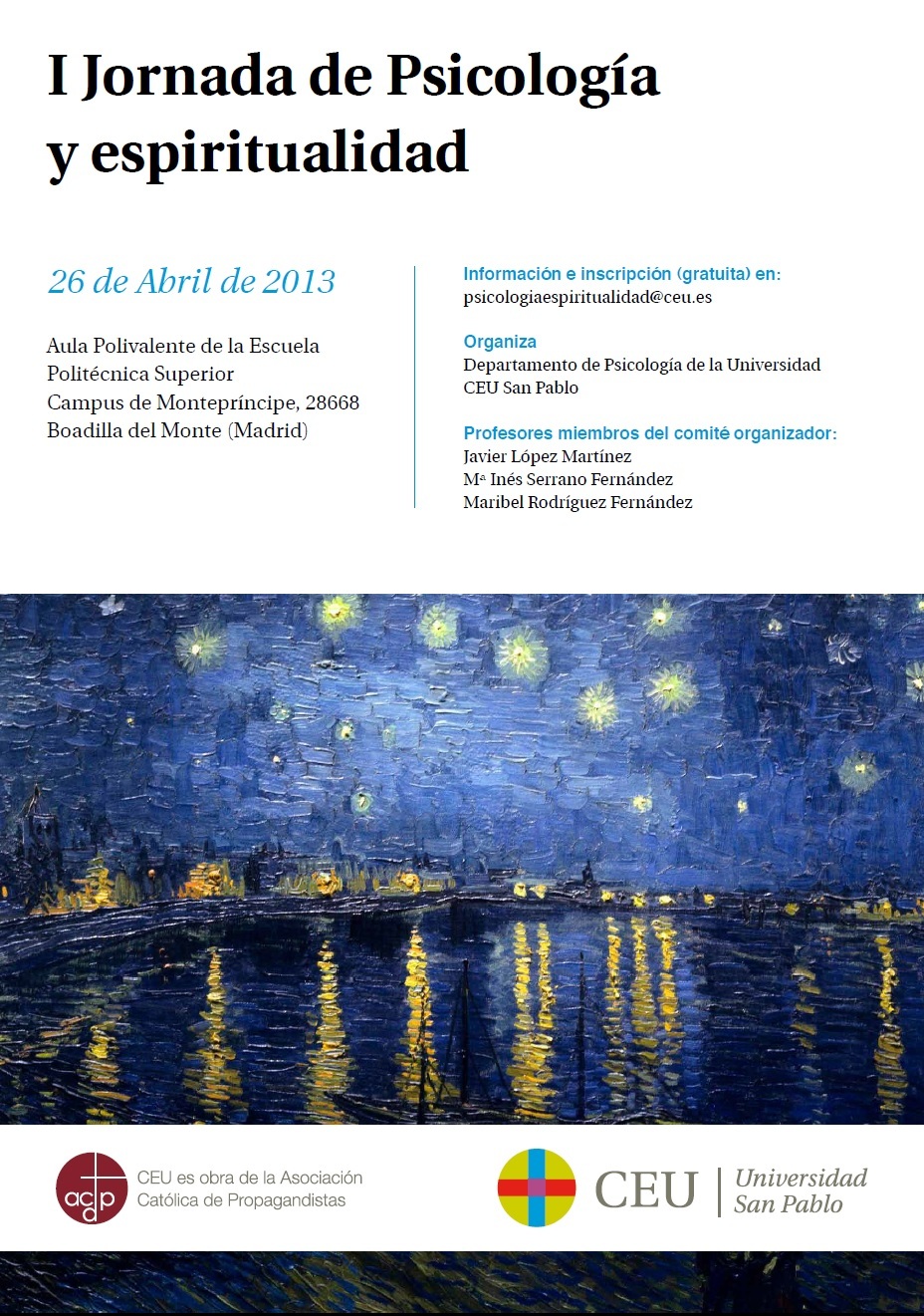 El día 26 de abril tenemos la I Jornada de Psicología y Espiritualidad en la Universidad San Pablo-CEU.El interés suscitado por los Congresos de Antropología, Psicología y Espiritualidad que hemos venido celebrando los últimos tres años en la Universidad de la Mística de Ávila, ha impulsado esta iniciativa, de hacer una Jornada en la Universidad San Pablo-CEU en la misma línea. Con el aliciente añadido de que esta jornada será gratuita, gracias a la financiación de la universidad, para poderla llevar a cabo.
