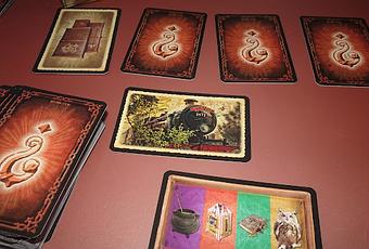 Las cartas de baúl que no se usan se pueden dejar en la caja y se comienza con las cartas de los objetos bien barajadas boca abajo en el centro. Es el mazo para robar, en orden el primer jugador recibe la carta de turno y dice “Voy a Hogwarts y traigo...” y coge la primera carta del mazo nombrando el objeto que hay en la carta. La coloca BOCA ABAJO al lado de la carta de alineación. El segundo jugador roba y dice “Voy a Hogwarts y traigo... Carta del jugador 1 + carta que acaba de robar” y así continúa el juego hasta que alguien se equivoca. Cada vez la secuencia es más grande y hay más cartas en juego.