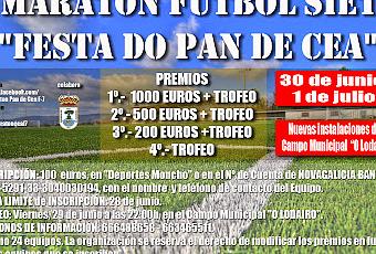 Os vindeiros días 30 de xuño e 1 de xullo e coincidindo coa XXI edición da Festa do Pan de Cea, terá lugar nas novas instalacións municipais de herba sintética de "O Lodairo" o "I Maratón de fútbol 7 Festa do Pan de Cea".Os premios serán os seguintes:1º clasificado: 1000euros + trofeo + pin de ouro do Pan de Cea + peza de Pan por xogador.2º clasificado: 500euros+ trofeo + pin de plata do Pan de Cea + peza de Pan por xogador.
