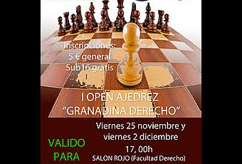 Entre los dias 25 de Noviembre y 2 de Diciembre, se disputará el primer abierto de ajedrez "Granadina Derecho". Un torneo organizado por la Delegación de Estudiantes de Derecho de la Universidad de Granada.