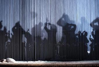 La sobriedad de la propuesta escénica de Emilio Sagi, que recorre caminos ya explorados, opta más por el componente meramente estético y contemplativo (y no por ello menos bello) que por el dramatúrgico que por otro lado esta trama operística demandaba, presentando una puesta en escena distensionada y de escaso movimiento que busca no distraer del puro canto situando de forma estática a una parte del coro a ambos lados superiores de la caja negra de triple pared que diseña Daniel Bianco, cuya escenografía de suelo de arena oscila entre la negrura del color imperante de la corte puritana en contraposición con la pureza del blanco que se impone al elevarse el fondo del escenario, alcanzando el mayor componente decorativo la legión de lámparas modelo araña que desciende del techo durante la entrada de Arturo y que también preside la escena de la locura donde Elvira, en su enajenación, porta una luna menguante.