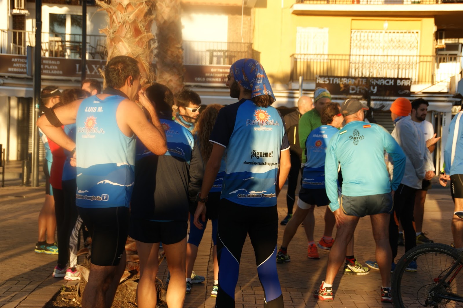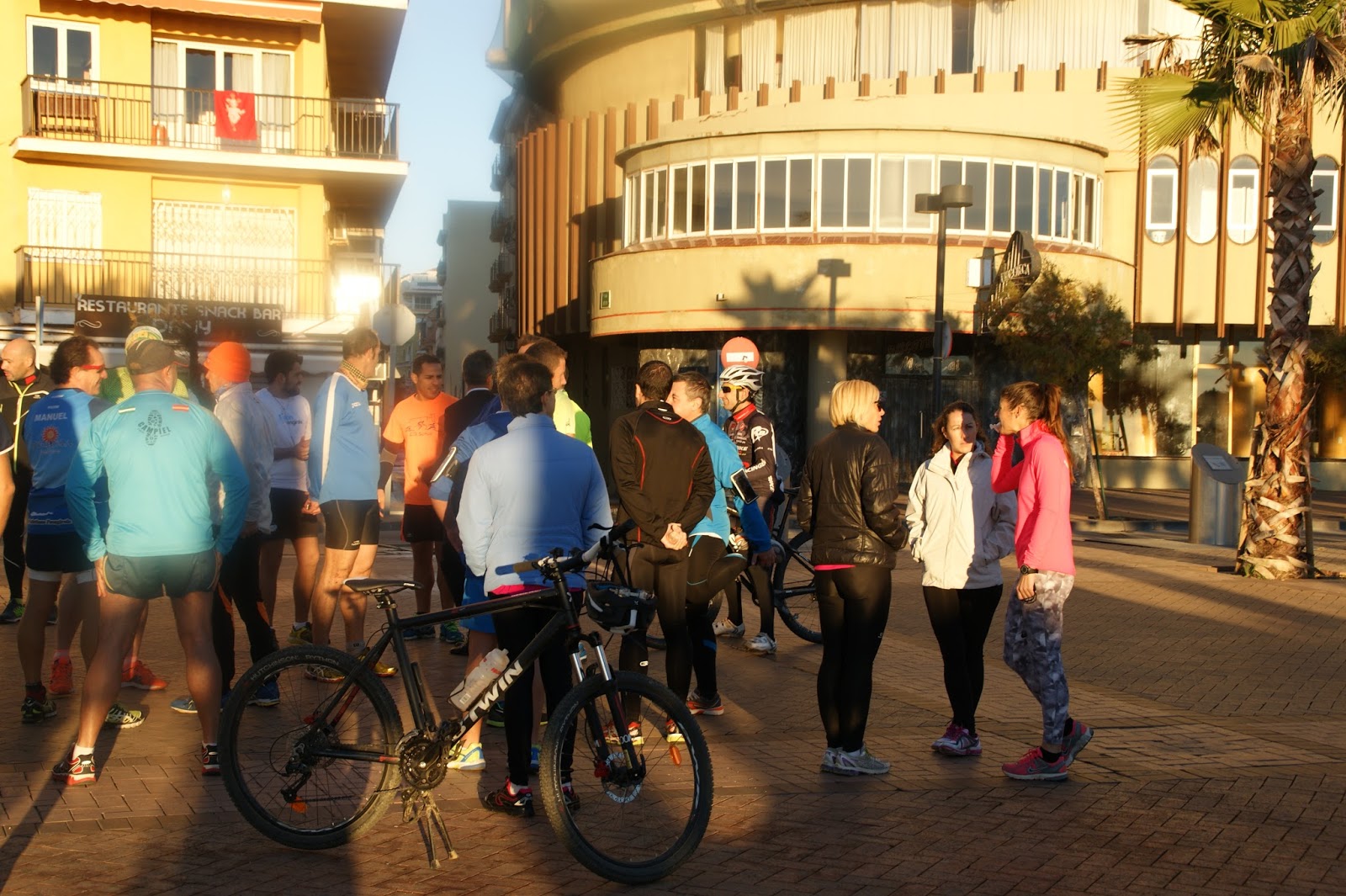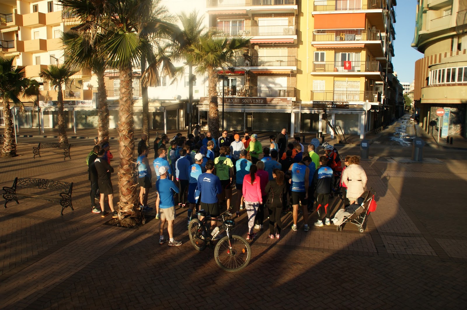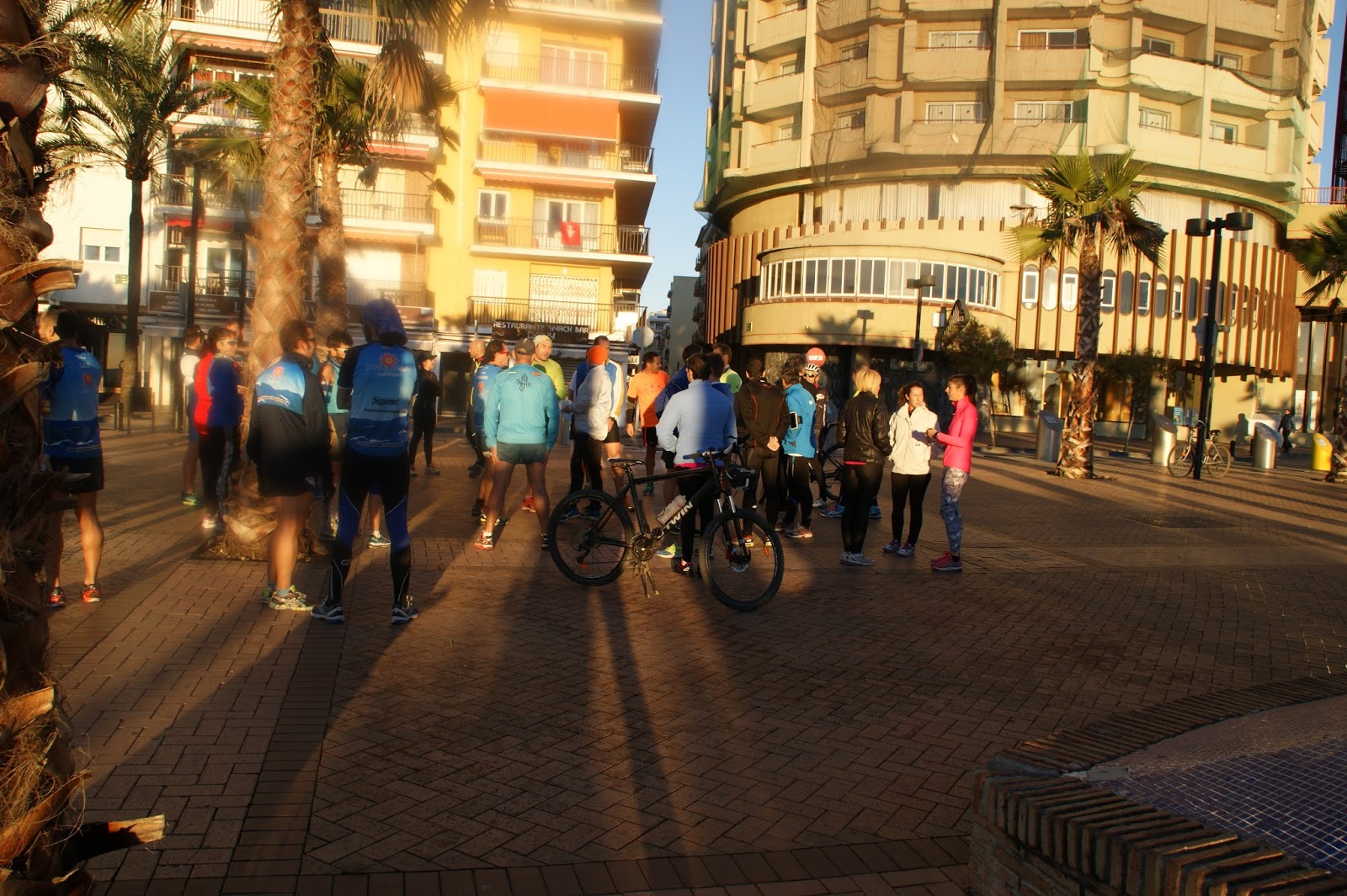 Tras comprobar cómo se manejaba en bici mochila a la espalda y cámara al cuello nos dirigimos hacia la plaza amarilla, inicialmente trotando y posteriormente caminando, ya que teníamos un margen de tiempo adecuado.Llegamos a las 8:55, justo a tiempo, y tras saludar a los compañeros del Club Atletismo Fuengirola, Sohail Trail, Triatlón Fuengirola y La Senda, me puse a charlar con varios amigos y conocidos, ya que desde la maratón de Málaga no veía a la mayoría. El frío, inusual en ese grado en la costa, invitaba a correr, pero esperamos pacientes hasta que los convocados cuya asistencia teníamos asegurada se incorporaron a la convocatoria, y tras unas palabras de los dirigentes de los diferentes clubes de atletismo, trail y triatlón de la localidad y una foto familiar, comenzamos a trotar, dirección Carvajal.Conocía a la gran mayoría de los atletas que acudieron a la convocatoria, de coincidir entrenando o compitiendo, pero había muchos con los que nunca había intercambiado palabra, por lo que la jornada fue perfecta para conocer a muchos de ellos.Avanzaba en una posición cercana al grupo de cabeza, liderado inicialmente por Jordi, cabeza visible de los corremontes locales, charlando animadamente con varios compañeros del Club de Triatlón de Fuengirola, de los más animados del pelotón, que avanzaban pasándose una Gopro de mano en mano mientras grababan el momento.Pero no sólo nos habíamos citado corredores, un grupo de ciclistas nos acompañaba y nos ayudaba en los cruces, interponiendo sus bicis momentáneamente entre los coches y nosotros para que pudiésemos cruzar con seguridad.Pasado el puerto deportivo nos llegó un mensaje desde atrás, de algunos compañeros del Club Atletismo Fuengirola "¡vais demasiado rápido!"Ya había advertido Isidro, presidente de dicho club, que no se trataba en absoluto de una competición, pero el grupito de cabeza, espoleados por la conversación, nos fuimos animando y apretando el paso sin casi darnos cuenta.En mi caso era el primer trote desde la maratón, había cogido mucha bici, pero no había vuelto a correr, para recuperarme por completo de la condromalacia y un absceso de grasa que fue a salirme (muy oportuno él) en el pulgar del pie izquierdo; ¡cómo me apetecía volver a correr!Al girarnos vimos que, en efecto, el grupo comenzaba a dividirse, por lo que frenamos el paso hasta que estuvimos juntos de nuevo.Rocío, del Club Atletismo Fuengirola cerraba el grupo con las féminas que nos acompañaban, y Javi, compañero del mismo club, lo lideraba ahora, aunque pasándose de revoluciones, por lo que cada pocas centenas de metros teníamos que recordarle que bajase el ritmo.Pese a haber salido "temprano", ya había mucho transeúnte en el Paseo Marítimo, buena parte de ellos también corredores, que nos saludaban al pasar o nos animaban, y alguno incluso aprovechaba para tomar una instantánea o unirse durante algunos metros.Los peatones no se sorprendieron demasiado de ver gente corriendo por el Paseo Marítimo, estampa habitual en cualquier época del año, pero sí de ver a un grupo tan grande avanzar al unísono, algo que muchos haría años que no veían. Entre risas, bromas y un buen paso que teníamos que ir ajustando para no dejar a nadie atrás llegamos al Gavia, donde habíamos acordado dar la vuelta ya que el estado del Paseo Marítimo a partir de ahí deja bastante que desear y además su estrechez podría hacer que nuestro paso fuese molesto para los viandantes, cosa que no era en absoluto nuestro objetivo, sino hacernos ver y demostrar que en Fuengirola hay corredores, corremontes y triatletas que luchan por fomentar sus respectivos deportes en la localidad, representando al municipio semana tras semana en competiciones provinciales, autonómicas e incluso estatales, sin apoyo ninguno salvo el de sus propios socios y simpatizantes.En el momento de girar noté ese temido chasquido en la rodilla izquierda, y desde ese momento tuve una dolorosa molestia en la pierna, exactamente igual a la que me apareció bajando del Calamorro el pasado mes de septiembre; se ve que este tiempo de reposo, lejos de ayudarme, me ha venido mal.No obstante, sé lo que es correr con dolor, así que hice de tripas corazón, puse mi mejor cara y continué con la marcha, ahora agradeciendo la suavidad del ritmo que antes me parecía "lento".Menos de una hora después de tomar la salida volvimos a la plaza, irrumpiendo en un sonoro aplauso y compartiendo impresiones sobre la jornada, antecedidas por nuevas intervenciones de los representantes de los clubes convocados.Pienso que todos terminamos con muy buen sabor de boca, conocimos muchos atletas estupendos y creamos vínculos con personas que tienen intereses muy similares a nosotros, de nuestro propio municipio, y que antes de la jornada ni si quiera conocíamos.Tenemos claro que queremos repetir, seguir dándonos visibilidad, porque aunque no hubiese periodistas ni cámaras, entre la difusión que nos den los peatones que nos viesen y la que nosotros mismos buscaremos por las redes sociales, conseguiremos que poco a poco se nos conozca (en nuestro propio municipio, la presencia en podios de forma regular en diferentes pruebas de los diferentes clubes que participaron ya nos hace conocidos semana tras semana allá por donde compitamos).No sabemos cuando, pero volveremos; para todos los que no pudiéseis asistir, os dejo un vídeo que grabaron los compañeros del Club Triatlón Fuengirola y una galería de imágenes que Mayte capturó de nuestro paso por el Paseo Marítimo.Esta mañana me he levantado aun con molestias en la rodilla izquierda, sobre todo al bajar escaleras, pero por una causa como esta, hoy mismo repetiría sin dudarlo; espero que este mes con las dos revisiones que me tocan (hematología y traumatología) pueda olvidarme del dolor al correr.¡Un abrazo!