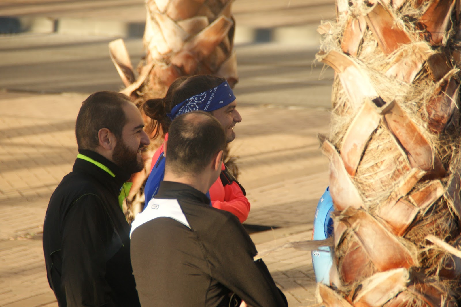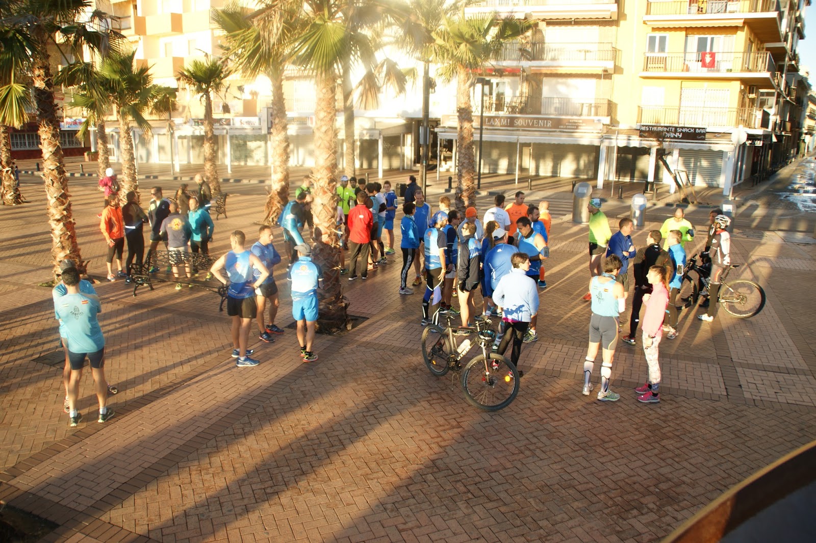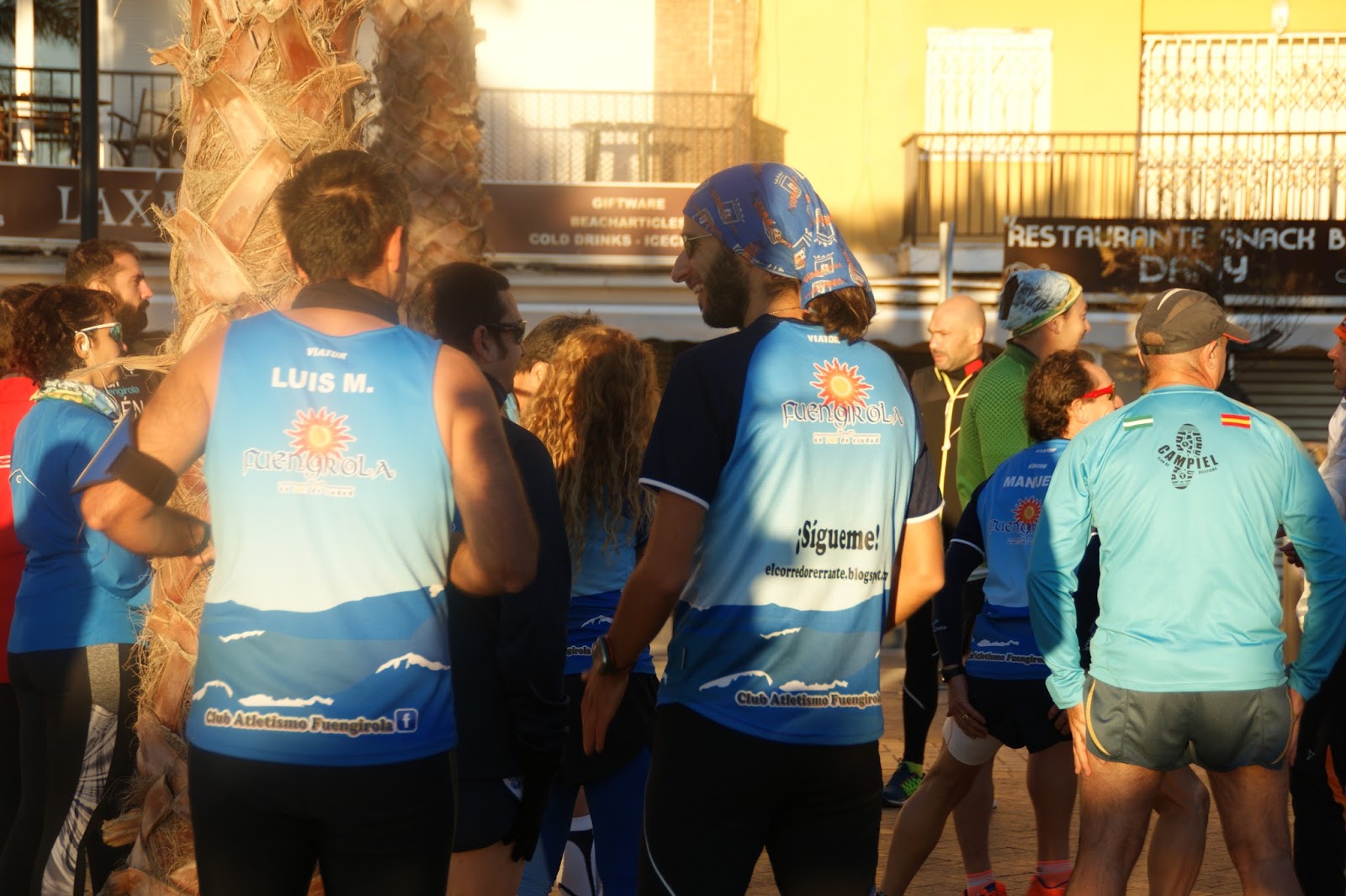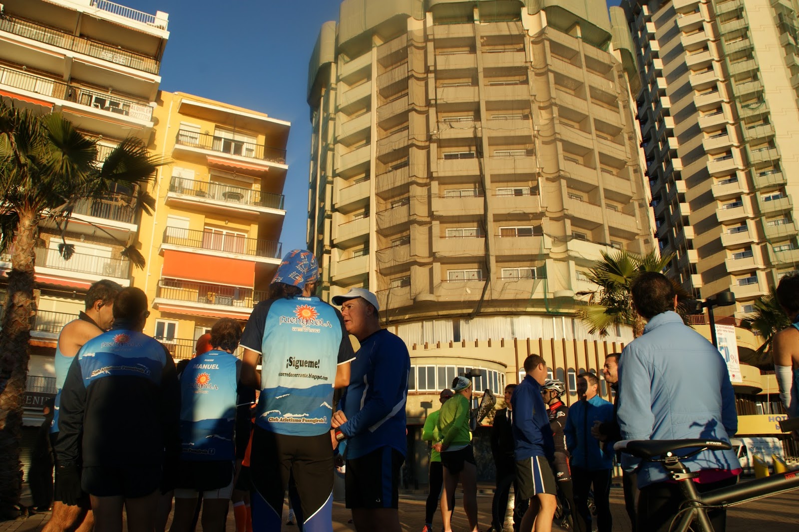 Tras comprobar cómo se manejaba en bici mochila a la espalda y cámara al cuello nos dirigimos hacia la plaza amarilla, inicialmente trotando y posteriormente caminando, ya que teníamos un margen de tiempo adecuado.Llegamos a las 8:55, justo a tiempo, y tras saludar a los compañeros del Club Atletismo Fuengirola, Sohail Trail, Triatlón Fuengirola y La Senda, me puse a charlar con varios amigos y conocidos, ya que desde la maratón de Málaga no veía a la mayoría. El frío, inusual en ese grado en la costa, invitaba a correr, pero esperamos pacientes hasta que los convocados cuya asistencia teníamos asegurada se incorporaron a la convocatoria, y tras unas palabras de los dirigentes de los diferentes clubes de atletismo, trail y triatlón de la localidad y una foto familiar, comenzamos a trotar, dirección Carvajal.Conocía a la gran mayoría de los atletas que acudieron a la convocatoria, de coincidir entrenando o compitiendo, pero había muchos con los que nunca había intercambiado palabra, por lo que la jornada fue perfecta para conocer a muchos de ellos.Avanzaba en una posición cercana al grupo de cabeza, liderado inicialmente por Jordi, cabeza visible de los corremontes locales, charlando animadamente con varios compañeros del Club de Triatlón de Fuengirola, de los más animados del pelotón, que avanzaban pasándose una Gopro de mano en mano mientras grababan el momento.Pero no sólo nos habíamos citado corredores, un grupo de ciclistas nos acompañaba y nos ayudaba en los cruces, interponiendo sus bicis momentáneamente entre los coches y nosotros para que pudiésemos cruzar con seguridad.Pasado el puerto deportivo nos llegó un mensaje desde atrás, de algunos compañeros del Club Atletismo Fuengirola "¡vais demasiado rápido!"Ya había advertido Isidro, presidente de dicho club, que no se trataba en absoluto de una competición, pero el grupito de cabeza, espoleados por la conversación, nos fuimos animando y apretando el paso sin casi darnos cuenta.En mi caso era el primer trote desde la maratón, había cogido mucha bici, pero no había vuelto a correr, para recuperarme por completo de la condromalacia y un absceso de grasa que fue a salirme (muy oportuno él) en el pulgar del pie izquierdo; ¡cómo me apetecía volver a correr!Al girarnos vimos que, en efecto, el grupo comenzaba a dividirse, por lo que frenamos el paso hasta que estuvimos juntos de nuevo.Rocío, del Club Atletismo Fuengirola cerraba el grupo con las féminas que nos acompañaban, y Javi, compañero del mismo club, lo lideraba ahora, aunque pasándose de revoluciones, por lo que cada pocas centenas de metros teníamos que recordarle que bajase el ritmo.Pese a haber salido "temprano", ya había mucho transeúnte en el Paseo Marítimo, buena parte de ellos también corredores, que nos saludaban al pasar o nos animaban, y alguno incluso aprovechaba para tomar una instantánea o unirse durante algunos metros.Los peatones no se sorprendieron demasiado de ver gente corriendo por el Paseo Marítimo, estampa habitual en cualquier época del año, pero sí de ver a un grupo tan grande avanzar al unísono, algo que muchos haría años que no veían. Entre risas, bromas y un buen paso que teníamos que ir ajustando para no dejar a nadie atrás llegamos al Gavia, donde habíamos acordado dar la vuelta ya que el estado del Paseo Marítimo a partir de ahí deja bastante que desear y además su estrechez podría hacer que nuestro paso fuese molesto para los viandantes, cosa que no era en absoluto nuestro objetivo, sino hacernos ver y demostrar que en Fuengirola hay corredores, corremontes y triatletas que luchan por fomentar sus respectivos deportes en la localidad, representando al municipio semana tras semana en competiciones provinciales, autonómicas e incluso estatales, sin apoyo ninguno salvo el de sus propios socios y simpatizantes.En el momento de girar noté ese temido chasquido en la rodilla izquierda, y desde ese momento tuve una dolorosa molestia en la pierna, exactamente igual a la que me apareció bajando del Calamorro el pasado mes de septiembre; se ve que este tiempo de reposo, lejos de ayudarme, me ha venido mal.No obstante, sé lo que es correr con dolor, así que hice de tripas corazón, puse mi mejor cara y continué con la marcha, ahora agradeciendo la suavidad del ritmo que antes me parecía "lento".Menos de una hora después de tomar la salida volvimos a la plaza, irrumpiendo en un sonoro aplauso y compartiendo impresiones sobre la jornada, antecedidas por nuevas intervenciones de los representantes de los clubes convocados.Pienso que todos terminamos con muy buen sabor de boca, conocimos muchos atletas estupendos y creamos vínculos con personas que tienen intereses muy similares a nosotros, de nuestro propio municipio, y que antes de la jornada ni si quiera conocíamos.Tenemos claro que queremos repetir, seguir dándonos visibilidad, porque aunque no hubiese periodistas ni cámaras, entre la difusión que nos den los peatones que nos viesen y la que nosotros mismos buscaremos por las redes sociales, conseguiremos que poco a poco se nos conozca (en nuestro propio municipio, la presencia en podios de forma regular en diferentes pruebas de los diferentes clubes que participaron ya nos hace conocidos semana tras semana allá por donde compitamos).No sabemos cuando, pero volveremos; para todos los que no pudiéseis asistir, os dejo un vídeo que grabaron los compañeros del Club Triatlón Fuengirola y una galería de imágenes que Mayte capturó de nuestro paso por el Paseo Marítimo.Esta mañana me he levantado aun con molestias en la rodilla izquierda, sobre todo al bajar escaleras, pero por una causa como esta, hoy mismo repetiría sin dudarlo; espero que este mes con las dos revisiones que me tocan (hematología y traumatología) pueda olvidarme del dolor al correr.¡Un abrazo!