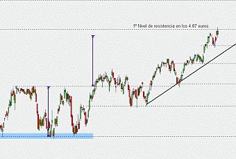 Nótese la línea directriz alcista que marca patrón desde mediados del pasado mes de julio. Estructura alcista muy definida de máximos y mínimos relativos crecientes, que debe continuar para seguir con confianza dentro del valor.