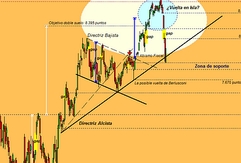 "... En el medio plazo pienso que las subidas continuarán hacia zonas de 8.400 puntos iniciando una fuerte distribución en el proceso. No creo que se superen los 9.000 puntos, aunque se podría estirar hacia los 9.300 puntos." Sin embargo, no basta con tirar de análisis posteriores publicados en nuestro Blog de Bolsa, toca pues, plantear el escenario actual y las posibles consecuencias del presente movimiento.