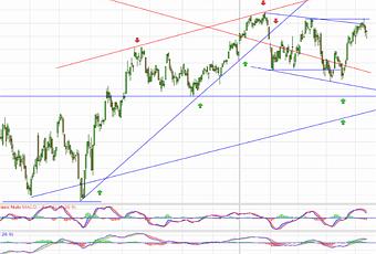 Los máximos de marzo hicieron mella en el selectivo. Está nuevamente bajo la banda superior del canal bajista de medio plazo. Solo la superación de los 8.670 puntos, en el corto plazo, me haría cambiar de opinión. Los blue chips están girando a la baja, Telefónica justo en la directriz de medio plazo, amenaza con romperla; Iberdrola reacciona desde mínimos en señal de fuerza, pero debe ratificar; Inditex está reaccionando con fuerza y volumen desde que se acercó a los 90 €; los bancos se deterioran con rapidez... en general los indicadores están todos cortados a la baja en señal de debilidad, sin embargo el selectivo ha cerrado casi en máximos de la sesión influenciado por el buen tono de los indicadores americanos. El mercado español está difícil. Igual el IBEX intenta girarse nuevamente al alza pero sí se vuelve a meter bajo los 8.400 puntos sería muy mala señal. Vigilar