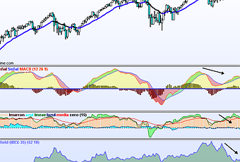 Parece que el MACD detecta que al acercarnos a esa zona la presión bajista disminuye, por eso sería interesante tomar posiciones alcistas si tocamos los 7580 y el IBEX rebota, pero OJO, posiciones muy especulativas y con los stops muy claros y cercanos.