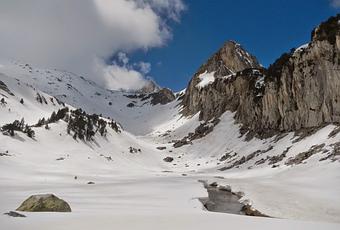 Llegamos al refugio y paramos a descansar. Tras el receso continuamos hacia los ibones de Paderna o de la Renclusa. A medida que vamos subiendo va aparenciendo delante nuestro, el esbelto Pico de Paderna (2.627 m). Al cabo de pocos minuto encontramos a los lagos totalmente cubiertos de nieve. Nos encontramos a más de 2.000 metros de altitud. El descenso lo hacemos por el mismo camino.