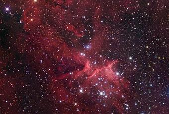 La radiación ultravioleta y los vientos estelares de las estrellas más viejas, después de la emisión y expansión de las nubes de IC 1805 hacia su vecina IC 1795 provocan el más reciente estallido de formación estelar hace tan sólo 100.000 años. Aunque es pequeña en comparación con sus vecinas, los bordes de IC 1795 forman una de las más grandes nubes moleculares conocidas en la Vía Láctea. La nube invisible (detectada por la emisión de radio CO) mide unos 200 años luz de diámetro y contiene una masa de 100.000 soles. Dos grupos dominantes de estrellas OB iluminan la región HII IC 1848. La nube de emisión tiene varias zonas brillantes a lo largo de su perímetro. Éstas representan puntos de contacto donde el frente de ionización se encuentra con el gas neutro más denso de la nube molecular adyacente. Ráfagas disparadas de formación estelar se están produciendo en los bordes claros de IC 1848 como la nube HII que se expande en el gas frío de los alrededores.
