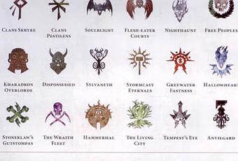 Son iconos de las facciones y sub-facciones de AoS. No se exactamente de que suplemento están sacados, pero lo cierto es que no tengo mucho interes en AoS, a lo mas superficial. Obviamente, faltan los que salen hoy en pre-pedidos, pero eso se arregla facil.