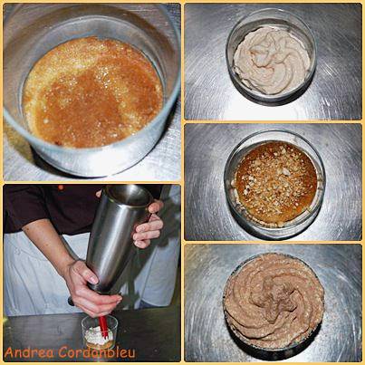 Se monta el aperitivo: se coloca un círculo de oloroso en el fondo. Se le añade espuma hasta la mitad. Se coloca otro bizcocho, se pone un poco de maíz, se rellena de espuma y se espolvorea cacao por encima. Se sirve en plato con blonda o servilleta.