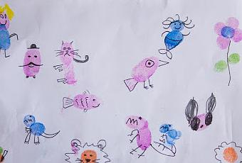 El otro día, en el maravilloso mundo de Pinterest, encontré esta imágen y le presenté a Mayor la actividad. De momento solo hemos estado practicando la técnica pero la cosa promete para futuras manualidades. Podemos crear un mundo entero desde nuestra imaginación y pintarlo con los dedos.