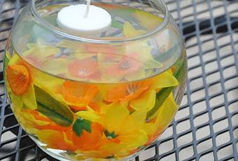 Recuerdo cuando estaba estudiando en la universidad, un amigo mío me regalo un adorno de casa precioso que me gustó mucho. Era una vela que flotaba en un vaso grande lleno de agua. En el fondo del vaso hubo arena y unas concha de la playa. Después de un par de años se me rompió el vaso y desde entonces quería hacer o comprar otro parecido pero hasta ayer no lo he probado. Como no estoy cerca de ningúna playa lo hice con flores artificiales que también quedó muy bonito.