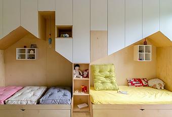 Este dormitorio cuenta con dos camas en forma de casa, que parten de una gran pieza de muebles que contienen armarios y estantes para el almacenamiento a lo largo de una de las paredes.