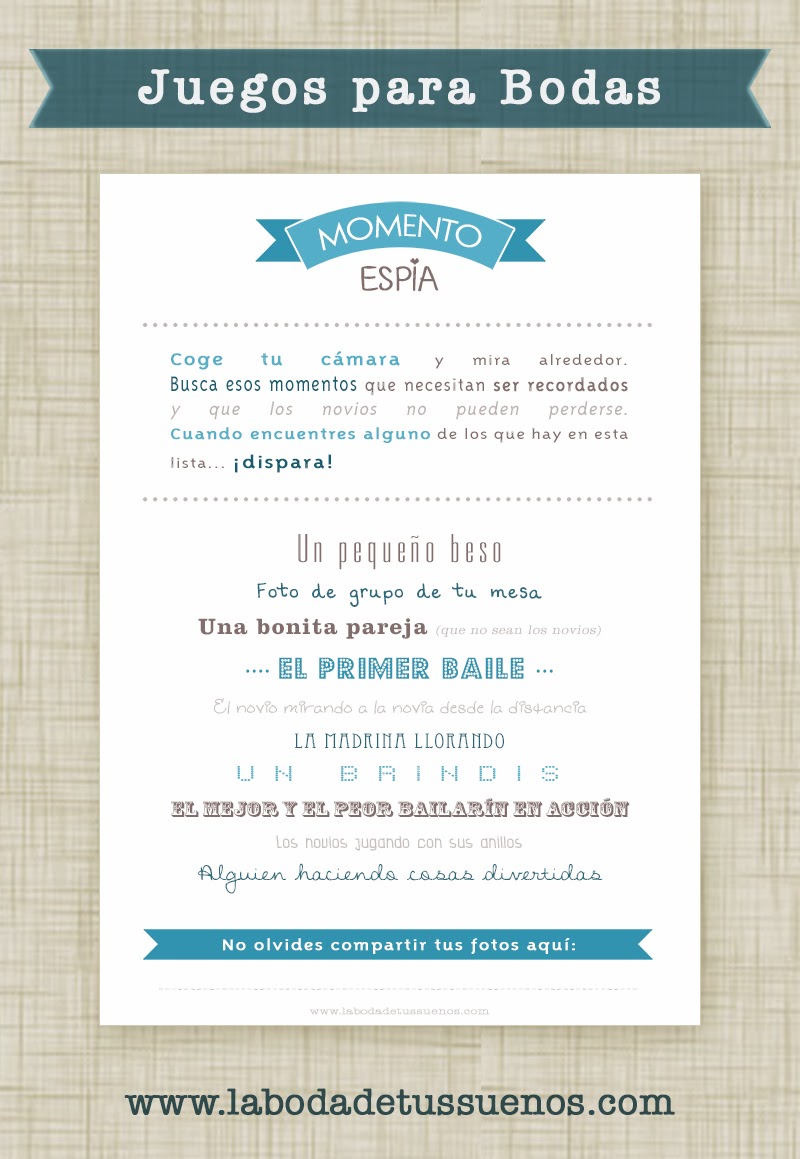 5) Un juego que mantendrá a vuestros invitados bien despiertos durante toda la boda es “I spy”. Consiste en dejar cámaras desechables en cada una de las mesas para que los invitados capten momentos mediante fotos (un abrazo, el novio besando a la novia, la madre de la novia llorando, alguien a quien has conocido por primera vez…). Las fotos quedarán como recuerdo para los novios y los invitados se entretendrán haciéndolas. Es un juego perfecto para las largas esperas entre plato y plato en el restaurante.
