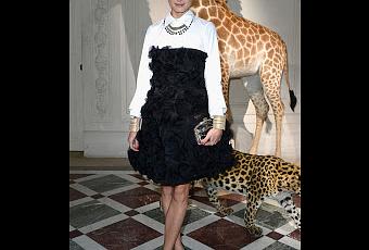 Eligió como complementos brazaletes dorados, collares y aros. Cabello recogido, stilettos negros y petaca para completar.