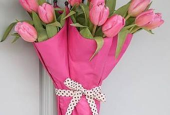Si rellenas ese viejo paraguas que tan solo se le han desmontado algunas varillas con flores y los amarras con un listón podrás tener un adorno floral hermoso para colgar en tu puerta.