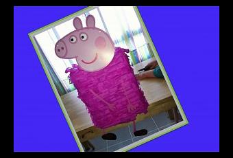 Cumpleaños Peppa Pig. Estos dibujos están de moda. A mi hija le encantan, así que en su cumpleaños lo tuvimos fácil, hicimos una piñata “Peppa Pig“. Este año tenia muy poco tiempo para organizar el cumpleaños así que no me compliqué demasiado, como veis en la foto, la piñata es una simple caja de cartón a la que le pegué papel pinocho y una careta con la cara de Peppa Pig (las compramos en Toyrus) unas patas de cartulina y ya está. Compramos vasos y platos de plástico y les pegamos pegatinas de Peppa Pig. En las bandejas de comida pinchamos carteles con la cara de la cerdita.
