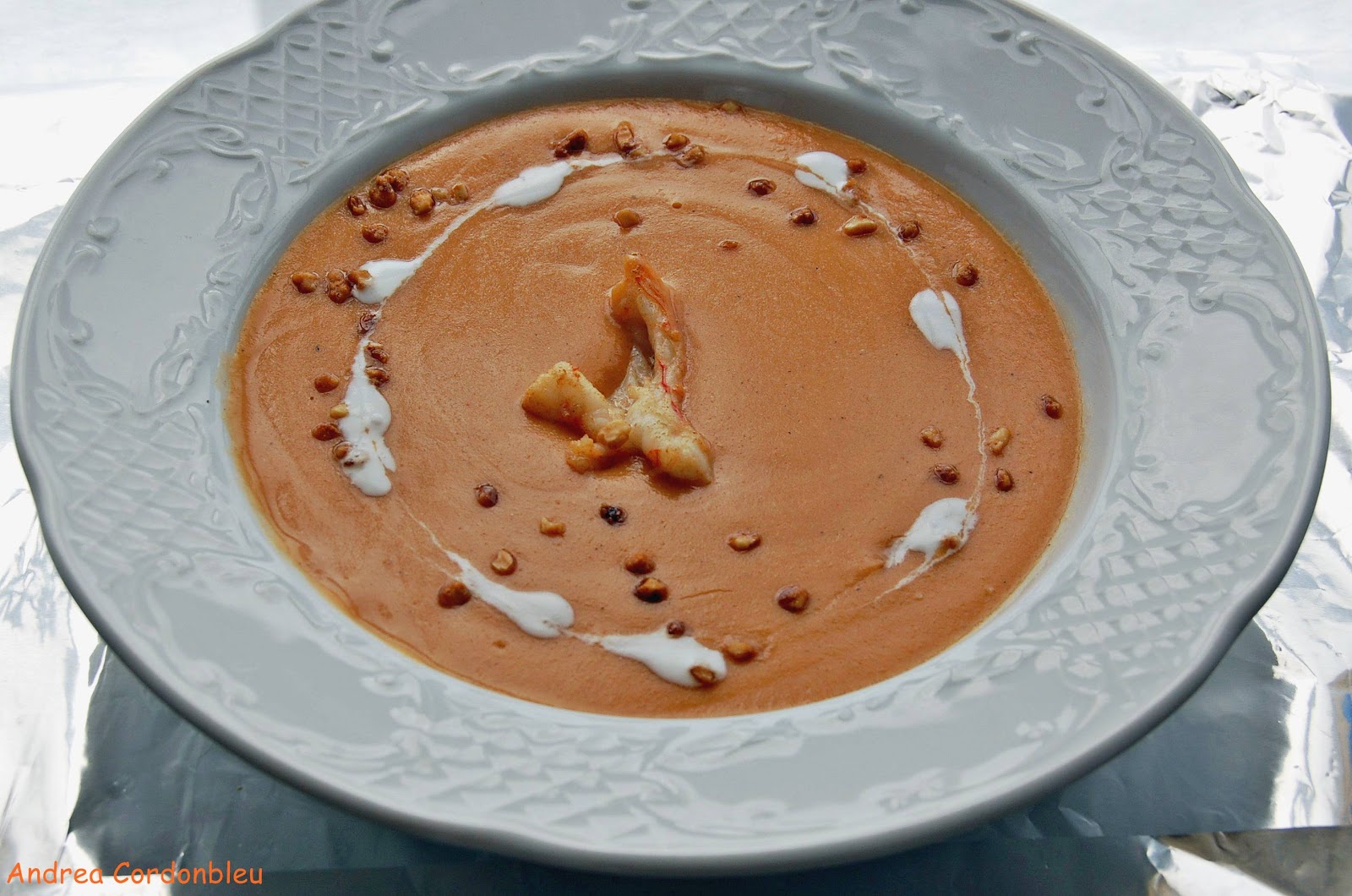 Se pelan algunas cigalas, gambas o langostinos para después decorar. Se reserva a un lado las cascaras y a otro la carne.Se limpia y se cota la cebolla, la zanahoria, el apio, el puerro y los tomates.Se rehoga con aceite de oliva virgen en un rodón u olla la cebolla, luego el apio, el puerro, la zanahoria y se le añade el perejil y el laurel.Una vez está todo bien rehogado se añade el marisco además de las cabezas, pieles y patas de los que se han pelado.Se va machacando todo con ayuda de la misma espumadera. Se deja que se cocine. Al final se añade el tomate y se marea. Se añade el arroz.Se moja con el brandy y se flambea. Se vierte el fumet.Una vez cocido, se bate (sin la hoja de laurel, hay que retirarla) y se pasa por un chino. Se pone de nuevo al fuego, se deja reducir un poco y se rectifica de sal y pimienta.Los langostinos o cigalas que se han reservado para la presentación, se cortan por la mitad a lo largo y se saltean con un poco se mantequilla en una sartén. Deben quedar doradas y jugosas.