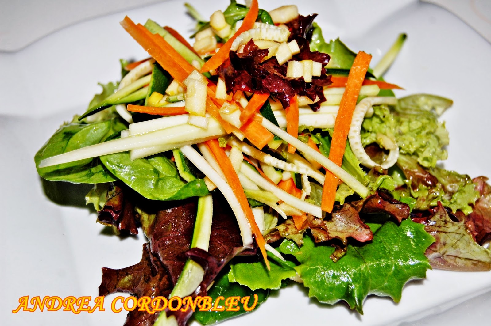 Se introducen los lomos de bacalao y se dejan cocinar a baja temperatura durante 15 minutos en total por ambos lados.Se pela la zanahoria y se lavan todas las hortalizas. Se corta la zanahoria y el calabacín en juliana y la manzana en dados. Se mezclan todas las hortalizas con los brotes tiernos y se pone un poco de sal y vinagre de arroz. Se añade el AOVE. Se mezcla todo bien y se coloca en un plato.