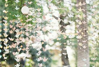 ¡Colgantes hechas con pequeños pájaros de origami! Tan delicado y a la vez llamativo, me parece un decorado de ensueño, idóneo para una boda, un bautizo, una fiesta de fantasía…