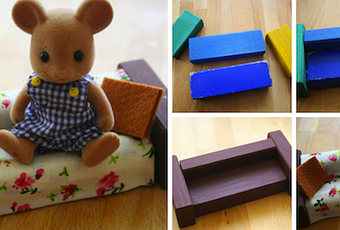 Si usas un bloque más puedes hacer una cama de juguete que puedes pintar del color que quieras, añadir pegamento y decorar con tela.