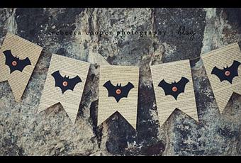 Hacer una guirnalda de Halloween es algo casi obligatorio, puedes hacer una como ésta de una forma muy sencilla: coge algunas hojas de un viejo libro que tengas destartalado y recorta la forma de un murciélago sobre cartulina negra. Si la cuelgas de una esquina a otra puedes añadir un efecto de telaraña con un poco de algodón.