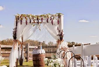 Si os decidís por una boda rústica, mirad que ideas tan bonitas podéis sacar para realizar vuestra ceremonia, con un altar cubierto de gasas blancas, flores, lazos y una bonita lampara de araña.Un barril de madera hace de mesa, y para la entrada del enlace unas puertas decoradas con flores y cajas. Para vuestros invitados.... sillas blancas y para el pasillo unos jarroncitos colgantes con paniculata y margaritas.